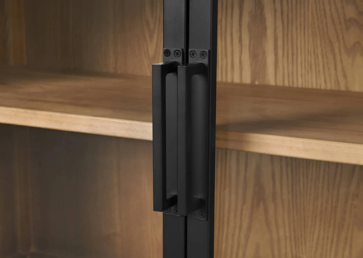 - Contrasting light wood interior allows for items inside to be well-showcased
