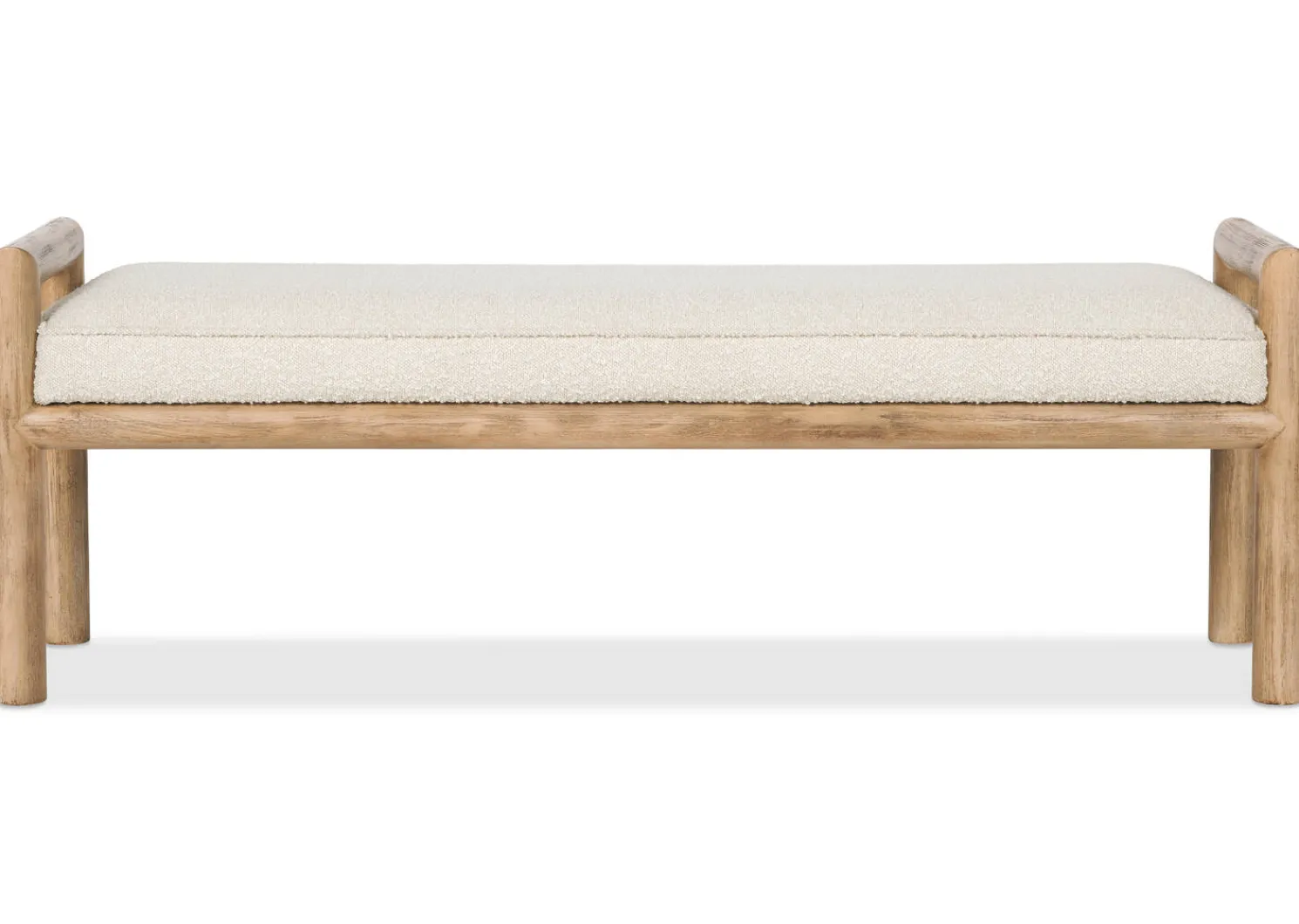 - The bench features a wire brushed texture that accentuates the wood grain on its thick, rounded posts