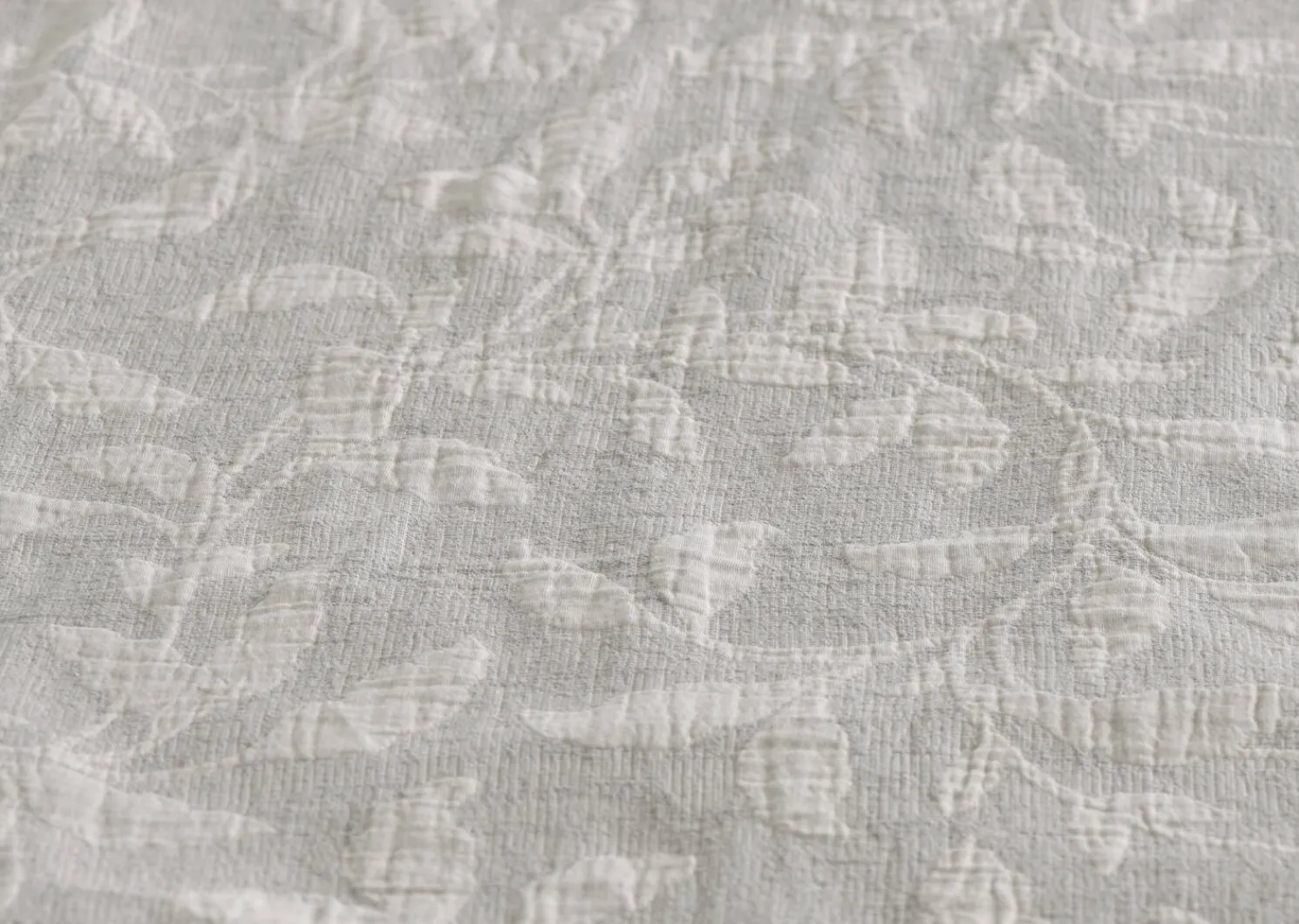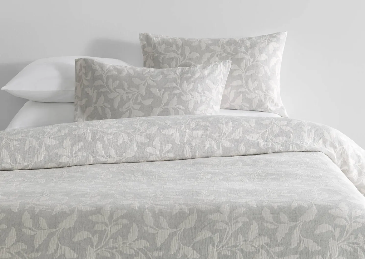 - Cotton jacquard duvet in light grey with ivory leaf pattern
