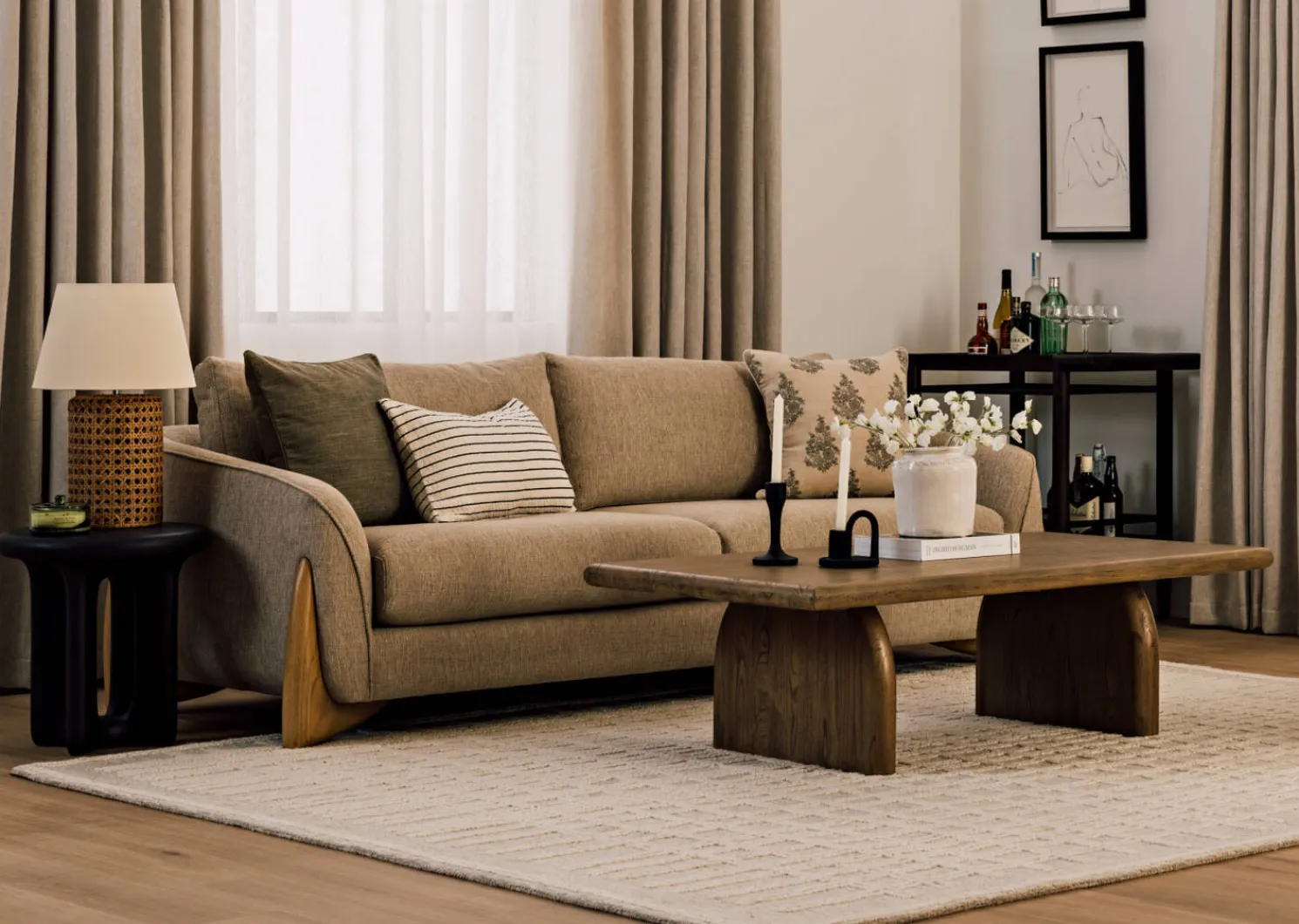 - Features gracefully curved legs and meticulously crafted mitered edges