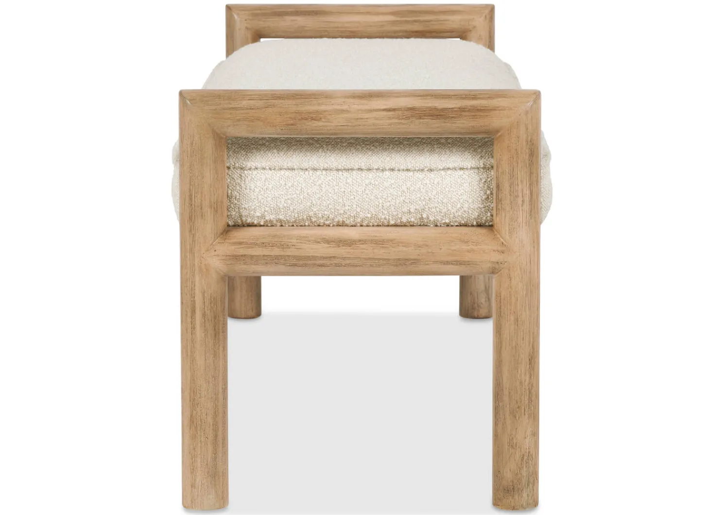 - The bench features a wire brushed texture that accentuates the wood grain on its thick, rounded posts