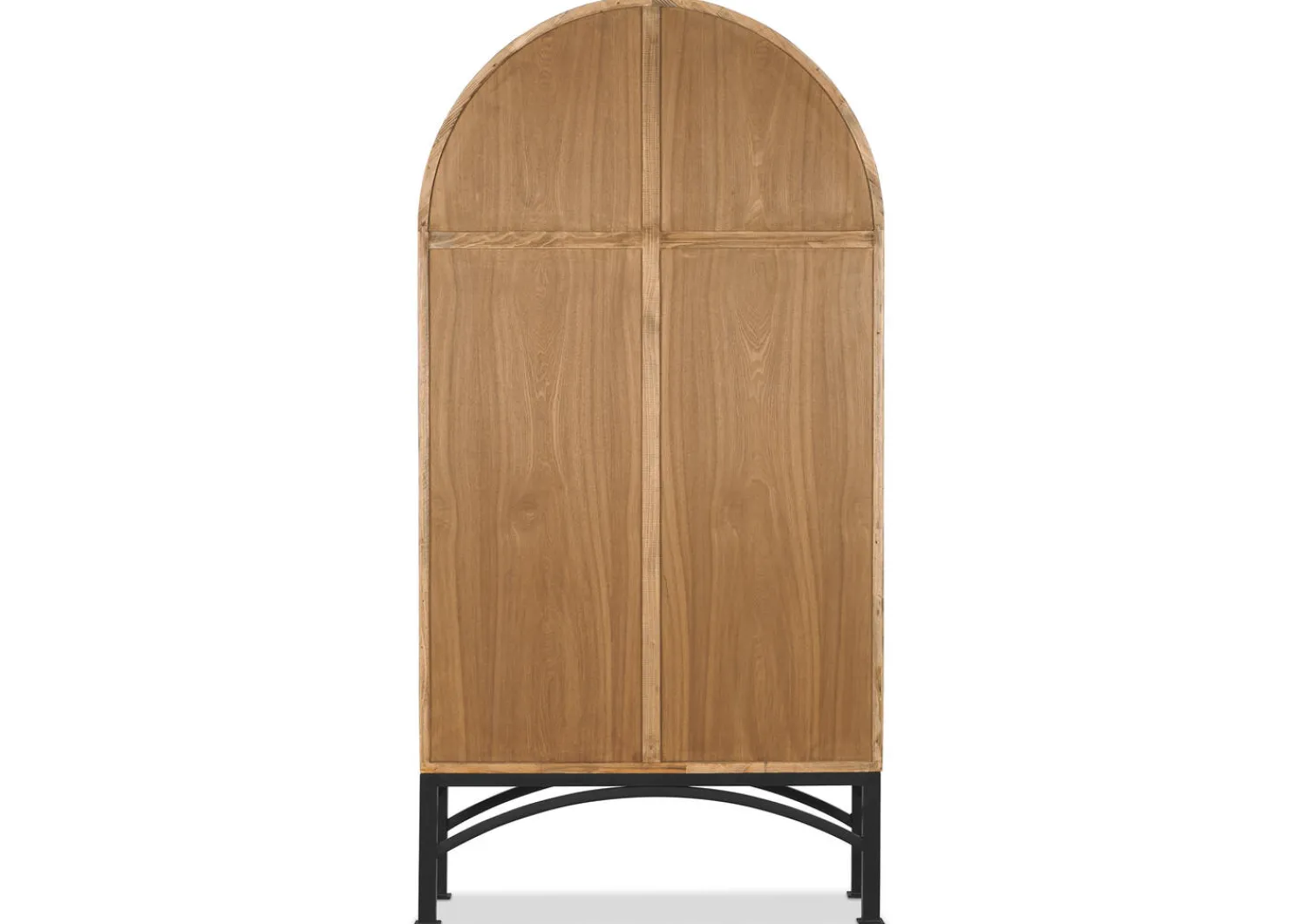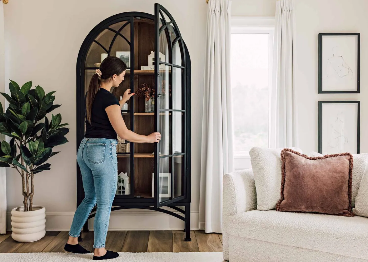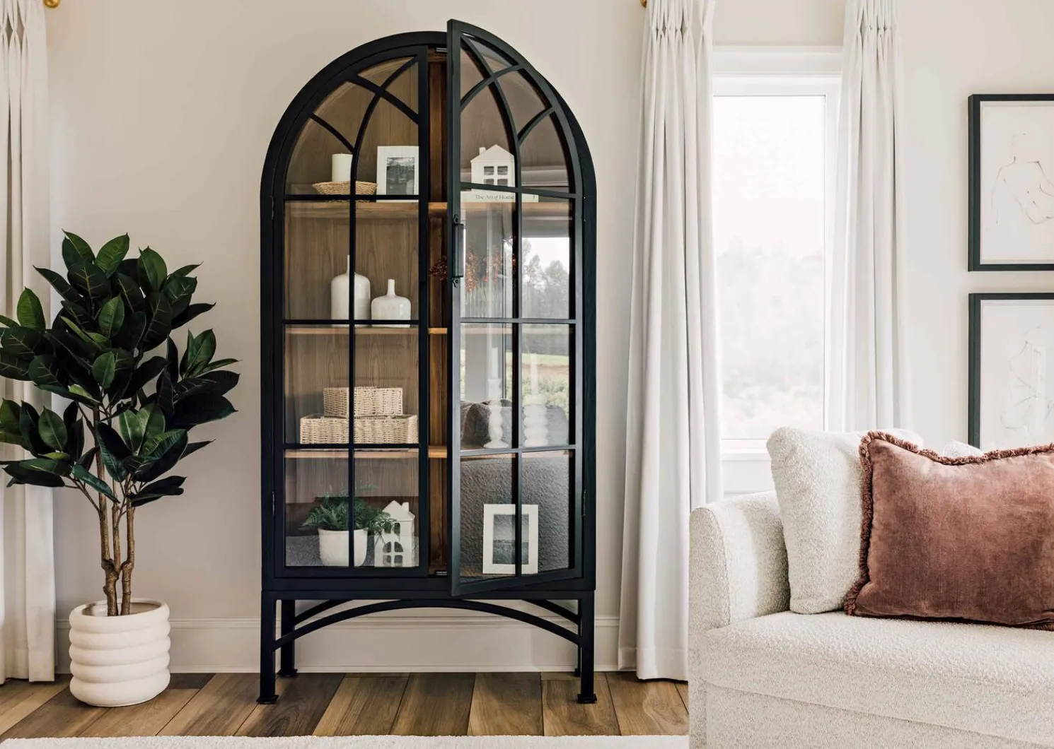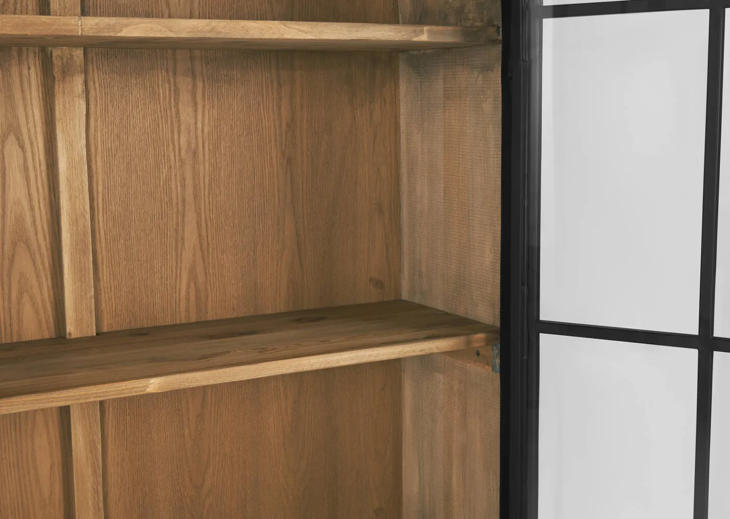 - Contrasting light wood interior allows for items inside to be well-showcased