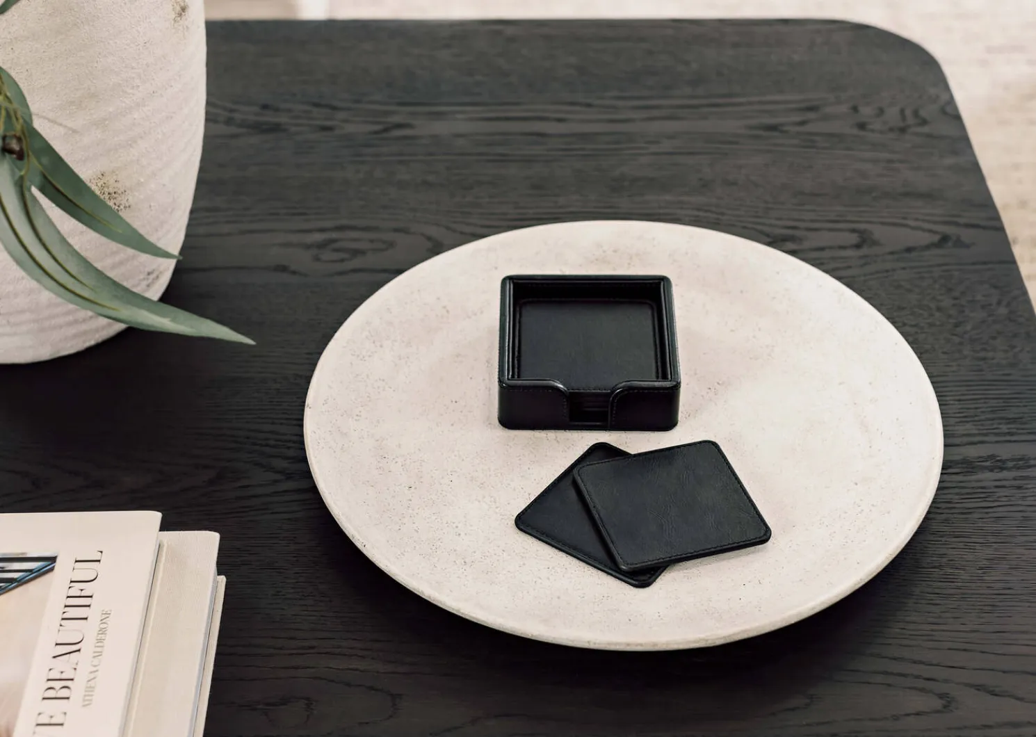 - Black vegan leather box for coaster storage